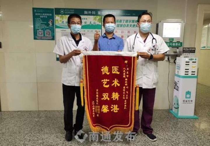 9月11日,启东市人民医院胸外科病房内,家住启东市寅阳镇庆佳村杨华(化名)非常激动,将一面印有“医术精湛德艺双馨”的锦旗送到胸外科主任叶飞及其团队手上:“真是多亏了人民医院的医生们,是你们精湛的技术、无微不至的照顾,让我老娘转危为安,现在我一颗悬着的心总算可以放下来了。”说完,眼里闪着泪光。