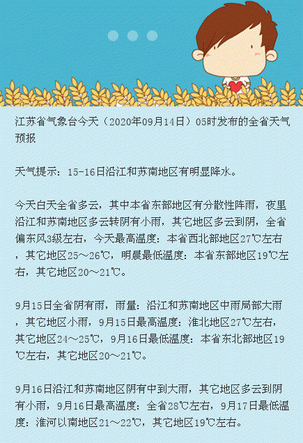 今天白天全省多云,其中本省东部地区有分散性阵雨,夜里沿江和苏南地区多云转阴有小雨,其它地区多云到阴,全省偏东风3级左右,今天最高温度:本省西北部地区27℃左右,其它地区25~26℃,明晨最低温度:本省东部地区19℃左右,其它地区20~21℃。