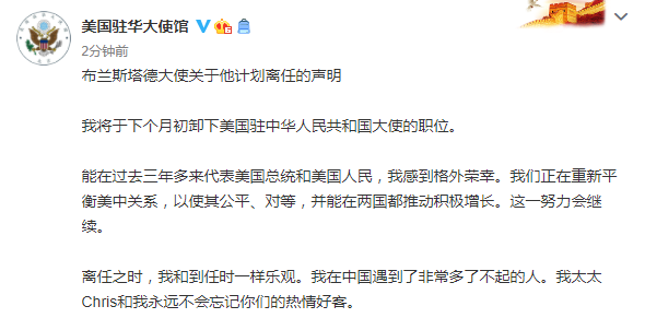 新京报快讯 据美国驻华大使馆官方微博消息,北京时间9月13日,美国驻华大使布兰斯塔德发布关于他计划离任的声明。布兰斯塔德在声明中表示,将于下个月初卸下美国驻中华人民共和国大使的职位。