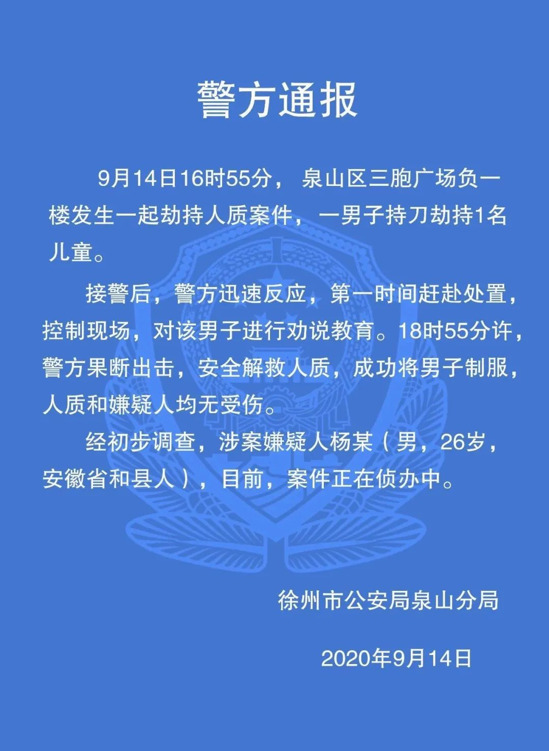 我苏网讯 据徐州市公安局泉山分局发布的通报,9月14日16时55分,泉山区三胞广场负一楼发生一起劫持人质事件,一男子持刀劫持1名儿童。目前,男子已被成功制服,案件正在侦办中。
