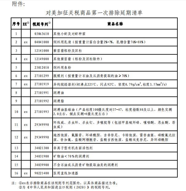 对附件所列16项商品,税委会公告〔2019〕6号规定的排除期限延长一年,即自2020年9月17日至2021年9月16日,继续不加征我为反制美301措施所加征的关税。