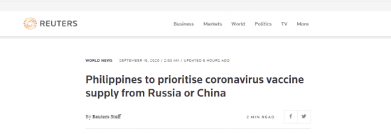 路透社:菲律宾将优先考虑俄罗斯或中国供应的新冠病毒疫苗