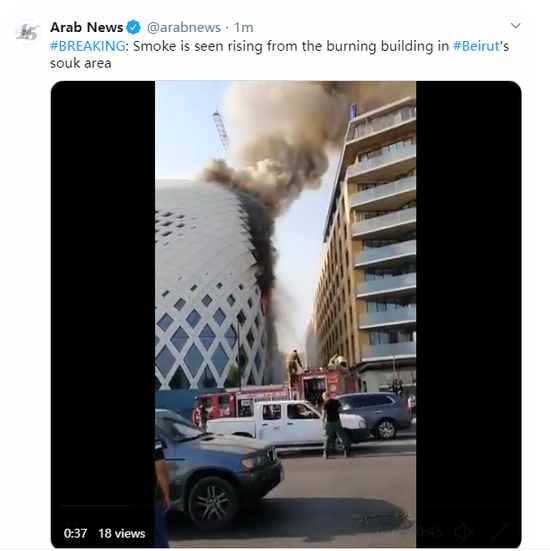 据阿拉伯新闻(Arab News)报道,黎巴嫩贝鲁特市中心商业区的一座标志性建筑发生火灾,燃烧的建筑物正冒出滚滚浓烟。截至目前,还没有收到任何人员伤亡的消息。