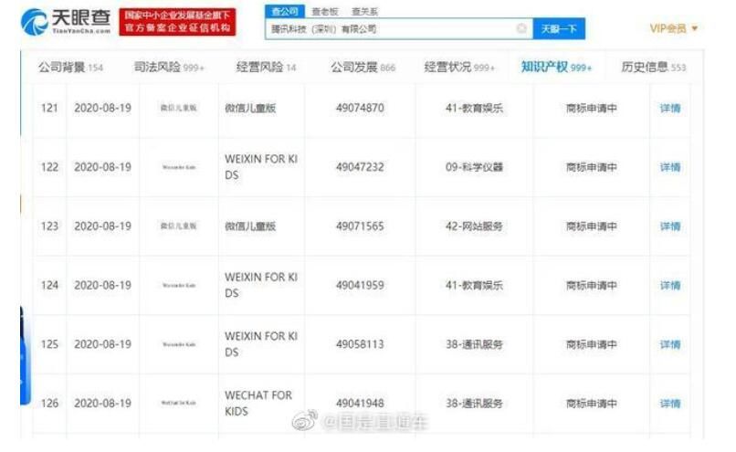 中新社“国是直通车”官方微博9月15日消息,天眼查数据显示,近日,腾讯科技(深圳)有限公司新增多条商标信息,其中包括多条“微信儿童版”、“WEIXIN FOR KIDS”的商标,商标状态均显示为“商标申请中”。涉及国际分类包括教育娱乐、科学仪器、网站服务等。