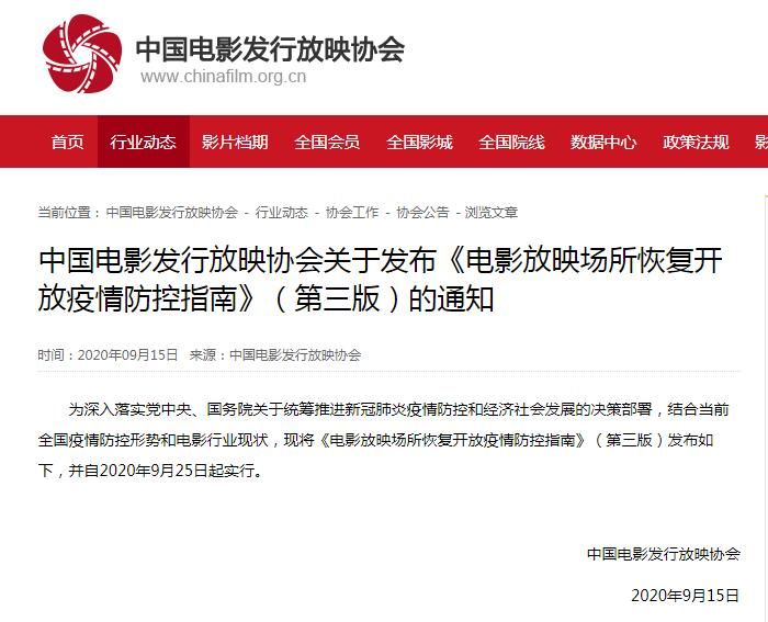为深入落实党中央、国务院关于统筹推进新冠肺炎疫情防控和经济社会发展的决策部署,结合当前全国疫情防控形势和电影行业现状,现将《电影放映场所恢复开放疫情防控指南》(第三版)发布如下,并自2020年9月25日起实行。