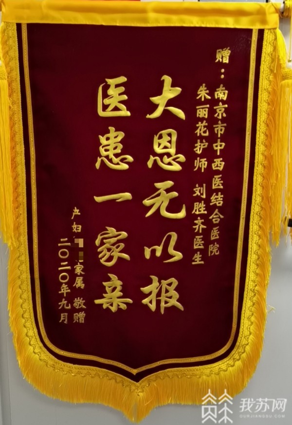 张女士一家对朱丽花及同事们的不厌其烦、热心周到的服务非常满意,特地制作了一面锦旗表达自己的感谢之情,上面八个字浓缩了夫妻俩的万语千言:“大恩无以报,医患一家亲!”