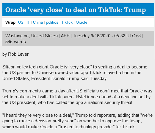 法新社消息,在此前给出的9月15日最后期限即将截止时,美国总统特朗普对甲骨文与TikTik的合作表态,他表示, “我听说他们非常接近达成协议,我们也会很快作出决定”。