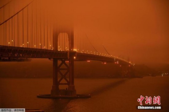 美国加州地区正在经历其有史以来最严重的山火季节,大火甚至蔓延到了华盛顿州及俄勒冈州。图为当地时间9日烟雾笼罩在旧金山湾区上空。
