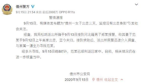 9月15日,有媒体发布题为“儋州一女子出走三天,监控没有出走身影”引发社会关注。