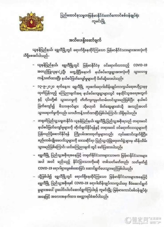 公告还指出,中华人民共和国云南省瑞丽市政府正在全力开展打击非法入境和遣送非法入境人员的工作。将对违反法规的人员进行拘留。同时,瑞丽市将对中国公民,包括缅甸公民在内的任何外国公民,进行新冠肺炎核酸检测。因此,缅甸驻昆明总领事馆郑重的要求,居住在瑞丽市的缅甸公民,积极参与并配合瑞丽市政府应对新冠肺炎疫情的防控工作,这样才能防控新冠肺炎的传播。