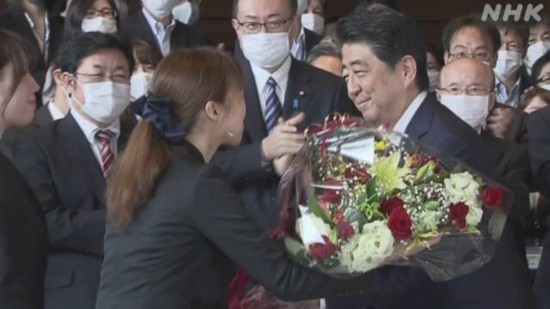 现场,约200人聚集在大厅门口送别安倍。安倍从官邸职员处收到一束鲜花,多次向人群挥手致意,众人也用掌声送别。安倍随后前往国会参加会议。