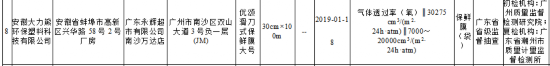 由安徽大力熊环保塑料科技有限公司生产、广东永辉超市有限公司南沙万达店销售的优颂滑刀式保鲜膜大号气体透过率(氧)不符合食品相关产品安全国家标准规定。该产品规格型号为30cm×100m,生产日期为2019年1月18日,不合格项目为气体透过率(氧),检验结果为30275 cm3/(m2·24h·atm),标准值为7000~20000cm3/(m2·24h·atm),检验机构为广州质量监督检测研究院。