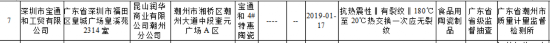 其中,由深圳市宝通和工贸有限公司生产、昆山润华商业有限公司潮州分公司销售的2批次宝通和2#与4#特惠陶瓷碗抗热震性不符合食品相关产品安全国家标准规定。该产品生产日期分别为2019年1月17日和18日,不合格项目均为抗热震性,检验结果均为有裂纹,标准值为180℃至20℃热交换一次应无裂纹,检验机构均为广东省潮州市质量计量监督检测所。