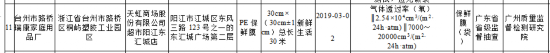 由台州市路桥瑞康家庭用品厂生产、天虹商场股份有限公司超市阳江东汇城店销售的PE保鲜膜气体透过率(氧)不符合食品相关产品安全国家标准规定。该产品规格型号为30cm×(30cm±1cm)总长30米,生产日期为2019年3月2日,不合格项目为气体透过率(氧),检验结果为2.54×104cm3/(m2·24h·atm),标准值为7000~20000cm3/(m2·24h·atm),检验机构为广州质量监督检测研究院。