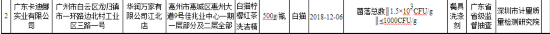 其中,由广东卡迪娜实业有限公司生产、华润万家有限公司江北店销售的白猫柠檬红茶洗洁精菌落总数不符合食品相关产品安全国家标准规定。该产品规格型号为500g/瓶,商标为白猫,生产日期为2018年12月6日,不合格项目为菌落总数,检验结果为1.5×103CFU/g,标准值为≤1000CFU/g,检验机构为深圳市计量质量检测研究院。