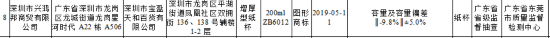 其中,由深圳市兴鸿邦商贸有限公司生产、深圳市宝盈天和百货有限公司销售的增厚型纸杯容量及容量偏差不符合食品相关产品安全国家标准规定。该产品规格型号为200ml ZB6012,生产日期为2019年5月11日,不合格项目为容量及容量偏差,检验结果为-9.8%,标准值为±5.0%,检验机构为广东省东莞市质量监督检测中心。