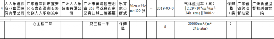 此外,由人人乐连锁商业集团股份有限公司生产、广州人人乐超市有限公司销售的乐齐家点断式保鲜膜气体透过率(氧)不符合食品相关产品安全国家标准规定。该产品规格型号为30cm×35cm×100张,生产日期为2019年3月8日,不合格项目为气体透过率(氧),检验结果为2.29×104cm3/(m2·24h·atm),标准值为7000~20000cm3/(m2·24h·atm),检验机构为广州质量监督检测研究院。