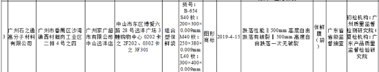 其中,由广州石之通高分子材料有限公司生产、广州家广超市有限公司中山远洋店销售的组合型保鲜袋跌落性能不符合食品相关产品安全国家标准规定。该产品规格型号货号为B-654 S40枚、200×300×0.009mm M40枚、250×380×0.009mm L40枚、300×400×0.009mm,生产日期为2019年4月15日,不合格项目为跌落性能,检验结果为500mm高度自由跌落有破裂,标准值为500mm高度自由跌落一次无破裂,初检机构为广州质量监督检测研究院,复检机构为广东产品质量监督检验研究院。