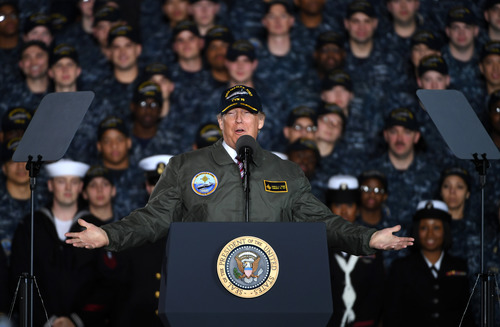 2017年3月2日,美国总统特朗普在美国航空母舰“福特”号上演讲。新华社记者殷博古摄