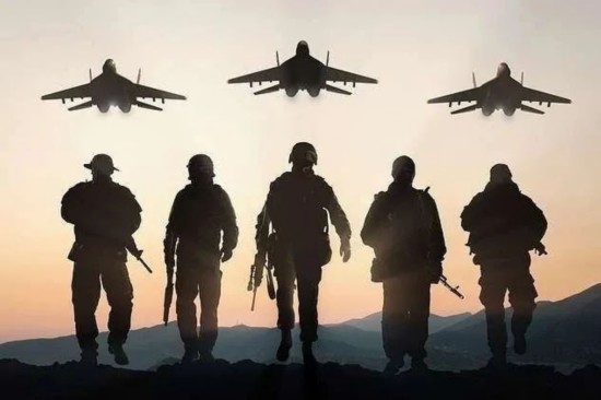 画面上,以群山为背景,持枪军人一字排开,3架战机飞过头顶。看上去还真有点好莱坞大片之感。
