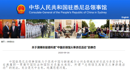 16日,中国驻悉尼总领事馆就澳媒体报道所谓“中国总领馆从事渗透活动”表态称,该馆致力于促进中国与新南威尔士州各领域友好交流与务实合作,在澳履职一贯遵守国际法和国际关系基本准则。所谓“总领馆及其官员从事渗透活动”的说法,完全是无中生有,纯属恶意污蔑。