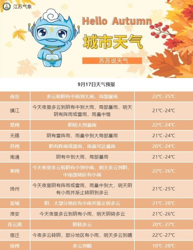 17日沿江和苏南地区阴有中到大雨、局部暴雨,江淮之间南部阴有阵雨,其它地区多云到阴。
