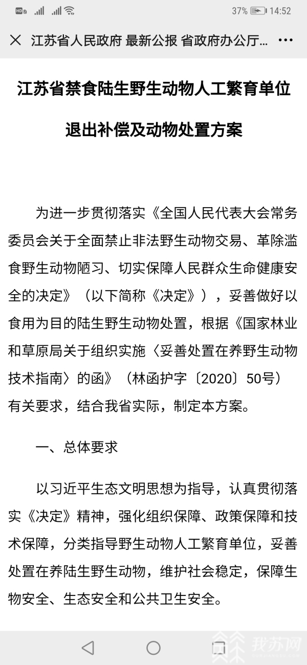 疫情发生以来,对滥食野生动物严重威胁公共卫生安全问题,社会反映强烈。日前,江苏省政府办公厅公布了《江苏省禁食陆生野生动物人工繁育单位退出补偿及动物处置方案》,江苏将支持、指导、帮助受影响的养殖户调整、转变生产经营活动,尽量减少人工繁育单位损失。