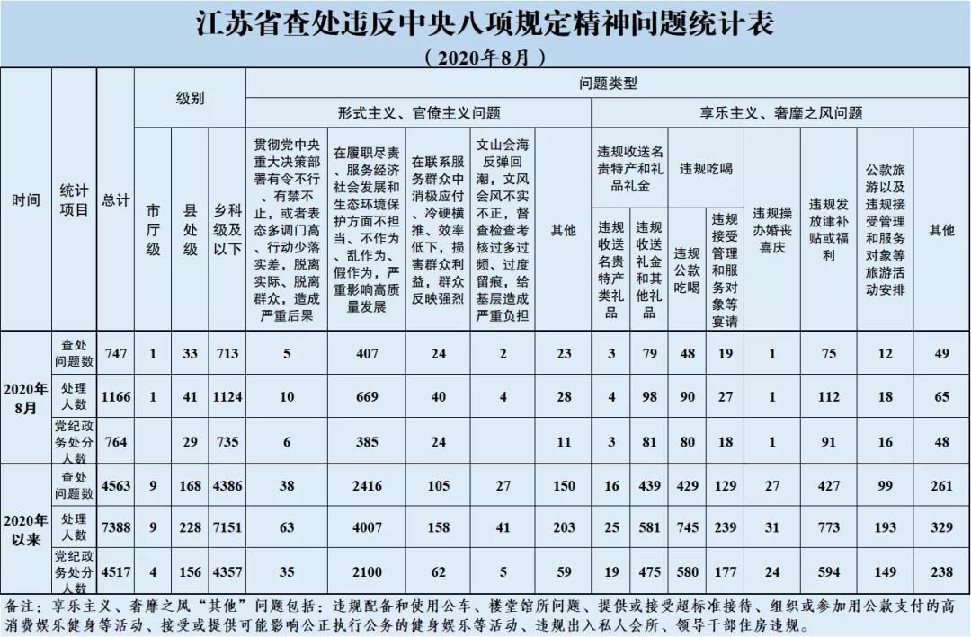 2020年8月,全省共查处违反中央八项规定精神问题747起,处理1166人,其中给予党纪政务处分764人。从问题类型看,查处形式主义、官僚主义问题461起、处理751人,查处享乐主义、奢靡之风问题286起、处理415人。从人员级别看,处理市厅级干部1人、县处级干部41人、乡科级及以下人员1124人。