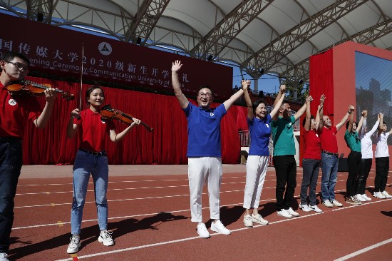 新京报讯 “中传,我来啦!”今日(9月17日)9时许,在年轻人清脆的呼喊声中,中国传媒大学(以下简称中传)2020级新生开学典礼举行。典礼上,教师代表、“重磅校友”以及校长廖祥忠分别致辞,联袂为学生们带来了精彩的“开学第一课”。典礼总导演、戏剧影视学院导演系主任、教授郑月向新京报记者介绍,在这“第一课”后为学生们发放、佩戴校徽,系导演组特别创造的仪式感,用以开启新生的大学生活。