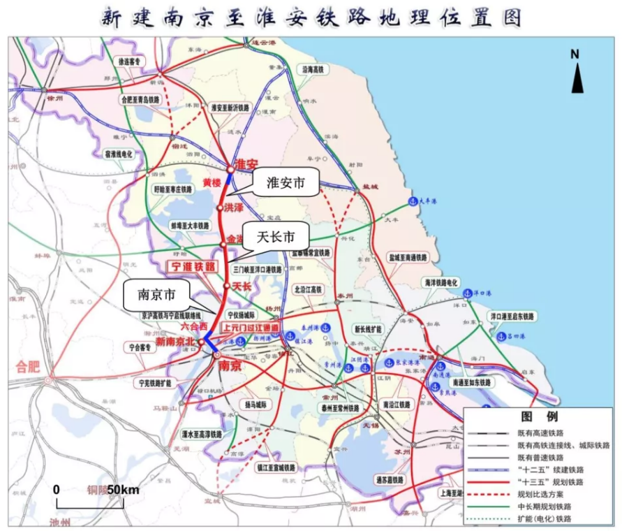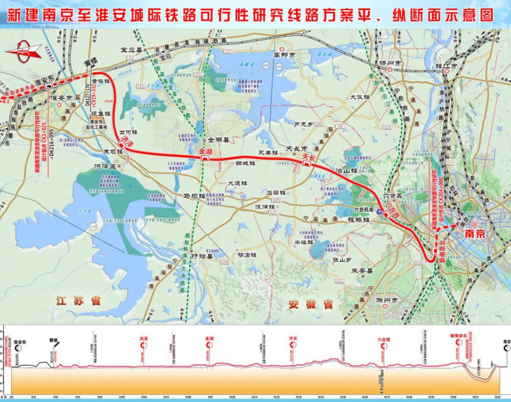 宁淮城际铁路,起自淮安,经洪泽、金湖、天长至南京,设计行车速度350km/h,预计将于2023年建成通车。
