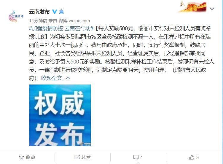荔枝新闻讯 据云南发布官方微博9月17日消息,瑞丽市人民政府发布消息称,为切实做到瑞丽市城区全员核酸检测不漏一人,在采样过程中所有在瑞丽的中外人士均一视同仁,费用由政府承担。同时,实行有奖举报制,鼓励居民、企业、社会各类组织举报未检测人员,经查证属实后,报经指挥部审批同意,及时给予每人500元的奖励。核酸检测采样补检工作结束后,发现仍有未检人员,一律强制进行核酸检测,强制定点隔离14天,费用自理。
