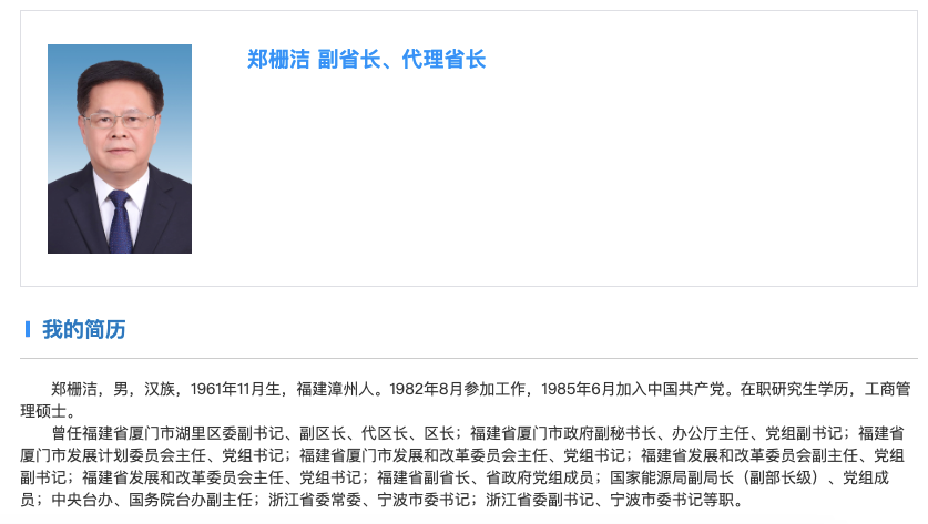 郑栅洁长期在福建工作,担任过国家能源局副局长(副部长级),中共中央台办、国务院台办副主任,2017年12月空降浙江,任浙江省委常委、宁波市委书记。