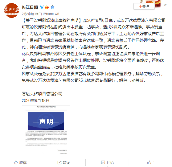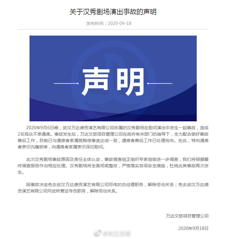 2020年9月6日晚,武汉万达德贡演艺有限公司所属的汉秀剧场在慰问演出中发生一起事故,造成2名观众不幸遇难。事故发生后,万达文旅项目管理公司在政府有关部门的指导下,全力配合做好事故善后工作,目前已与遇难者家属就赔偿事宜达成一致,遇难者善后工作已处理完毕。在此,特向遇难者表示沉痛哀悼,向遇难者家属表示深切慰问。