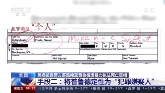 而在披露的另一份报告当中,在犯罪类型一栏,普鲁德原本被标注为“个人”,但此后,包括这一栏和普鲁德的名字又用红笔圈出,并标注:“把他定义为犯罪嫌疑人。”