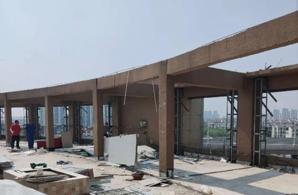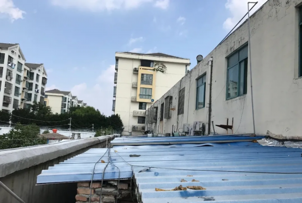 淮安经济技术开发区东城商贸三号楼西侧,在楼顶边缘临时搭建了仓库,没有任何加固措施,摇摇欲坠,十分危险。城管部门对此处违建进行了拆除,保障了周边市民的安全。