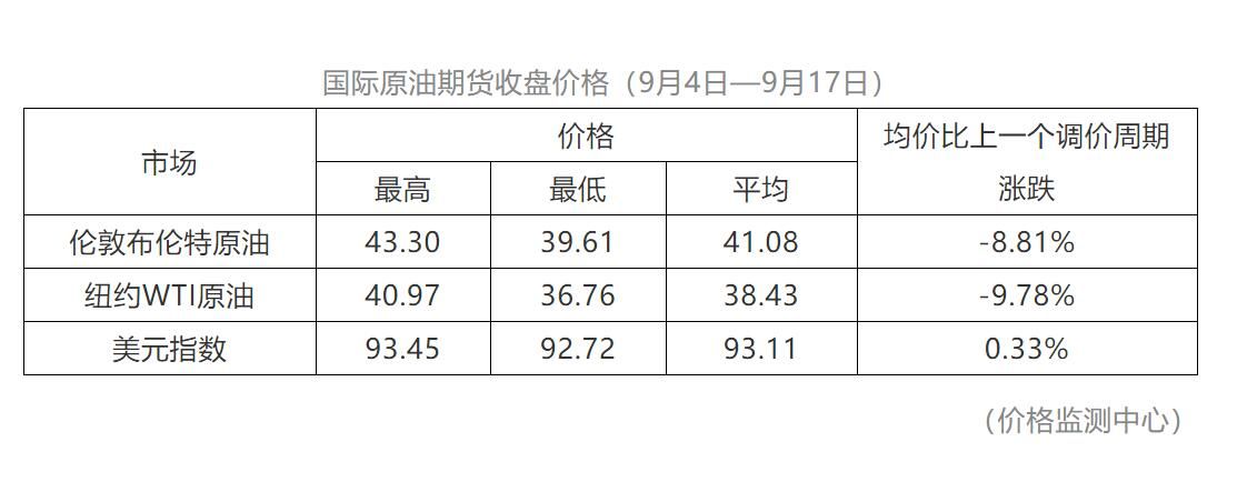 据国家发改委价格监测中心监测,本轮成品油调价周期内(9月4日—9月17日),国际油价大幅下降。平均来看,伦敦布伦特、纽约WTI油价比上轮调价周期下降9.29%。受此影响,国内汽油、柴油零售价格随之下调。