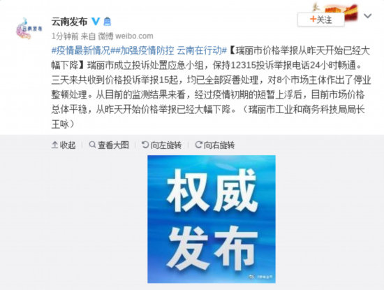 瑞丽市成立投诉处置应急小组,保持12315投诉举报电话24小时畅通。三天来共收到价格投诉举报15起,均已全部妥善处理,对8个市场主体作出了停业整顿处理。从目前的监测结果来看,经过疫情初期的短暂上浮后,目前市场价格总体平稳,从昨天开始价格举报已经大幅下降。(瑞丽市工业和商务科技局局长王咏)