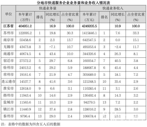 据江苏省邮政管理局今天(9月18日)发布的消息,今年1-8月,江苏全省快递服务企业业务量累计完成40.5亿件,同比增长16.9%;业务收入累计达424.9亿元,同比增长10.9%。