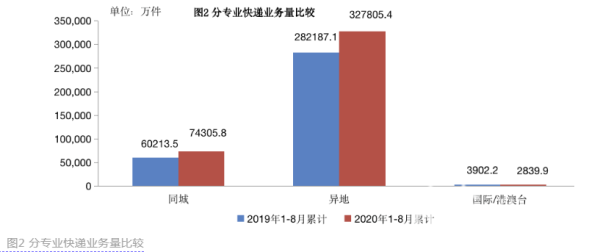 今年1-8月,同城、异地、国际/港澳台快递业务量分别占全部快递业务量的18.3%、80.9%和0.7%;业务收入分别占全部快递收入的10.1%、60.8%和11.9%。