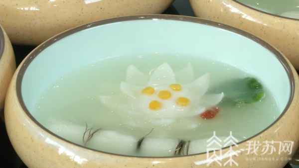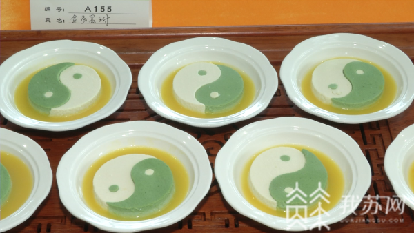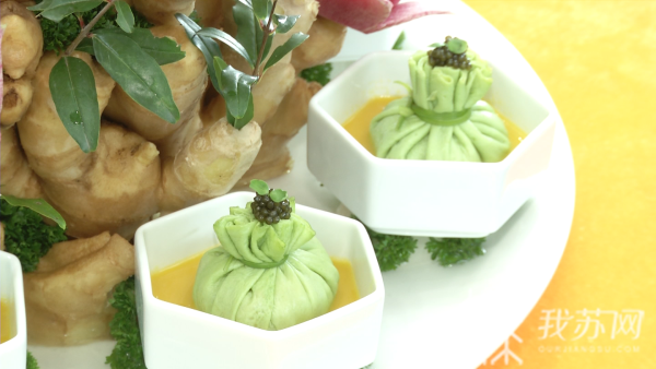 这道获得烹饪比赛金奖的作品叫做金陵富贵石榴球,看上去像是翡翠烧卖,但是选材要讲究 得多。它的皮是用混入了蔬菜汁的蛋皮制作而成,里面的馅料是新鲜的蟹粉加上鱼肉制作而成,为了造型好看,还点缀了鱼子酱,配以金黄色的高汤,现在正是吃螃蟹的季节,这道菜不仅非常应景,而且味道想必也非常鲜美。