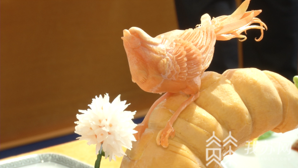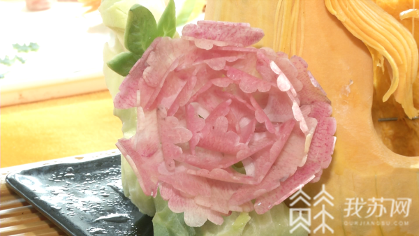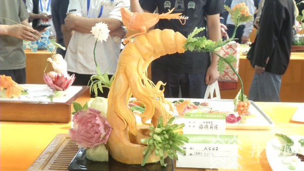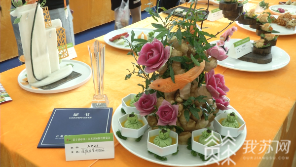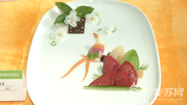 在第10届江苏国际餐饮博览会的现场展示了很多参加烹饪大赛的选手的作品,这道作品叫做鸟语花香,树干是用南瓜雕刻的,鸟是用胡萝卜雕刻的,而造型各异的菊花和叶子是由各种颜色的萝卜雕刻而成的,再来看这边的冷盘,看上去像一幅画,可以看出这个雕工非常细致入微,十分精美。
