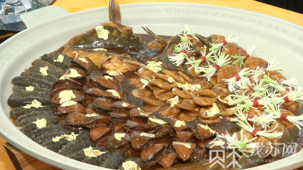 这道菜是一家酒店的招牌菜叫鮰鱼佛跳墙,普通的鮰鱼只有三四斤重,这道菜选用了22斤重的人工养殖的鮰鱼,此外还有鲍鱼、海参、鮰鱼肚等等,配上酒店独制的秘方,用中火炖一个多小时, 才能做成这样一道美味,更特别的是可以看到食材上铺了可食用的金箔。
