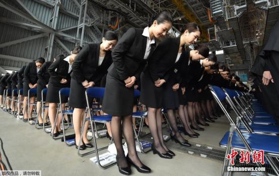 资料图:日本全日空集团在东京举行新职员入职仪式,2800名新职员正装参加运作整齐划一。