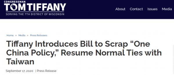 在美国副国务卿克拉奇蹿访台湾之时,有美国政客继续挑拨两岸关系。据台湾“中央社”18日消息,当地时间17日,美国联邦众议员汤姆·蒂法尼(Tom Tiffany)宣布已提出一项共同决议案,呼吁美国恢复与台湾“邦交”关系,并终结“过时且适得其反的一中政策”。
