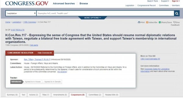 (蒂法尼提出共同决议案,美国国会官网截图)