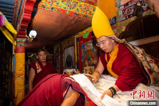 15日下午,在扎什伦布寺日光殿,十一世班禅登上法座,接受了扎什伦布寺管委会僧人成员、高僧的虔诚朝拜,为他们摸顶赐福、赐赠护结,并带领高僧诵经祈祷。