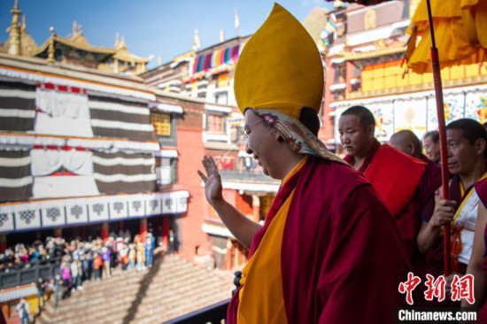 9月16日,十一世班禅在扎什伦布寺朝拜途中,在千佛廊三楼向信众、游客挥手致意。 何蓬磊 摄