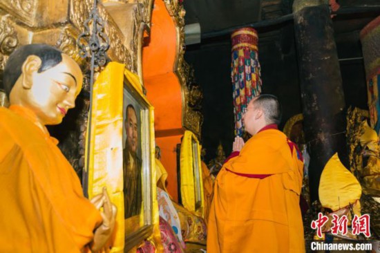 在殿内,十一世班禅虔诚叩拜供奉于此的佛祖释迦牟尼和藏传佛教格鲁派始祖宗喀巴的佛像,与众僧共同念诵经文后,回到寝宫拉让殿。