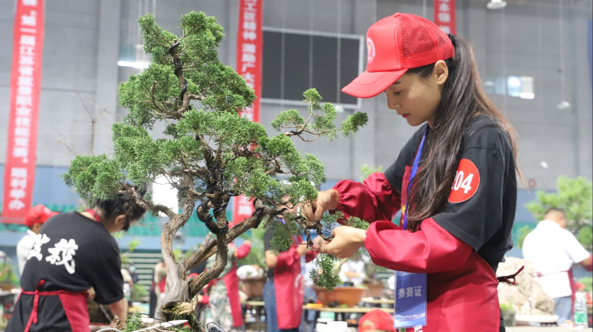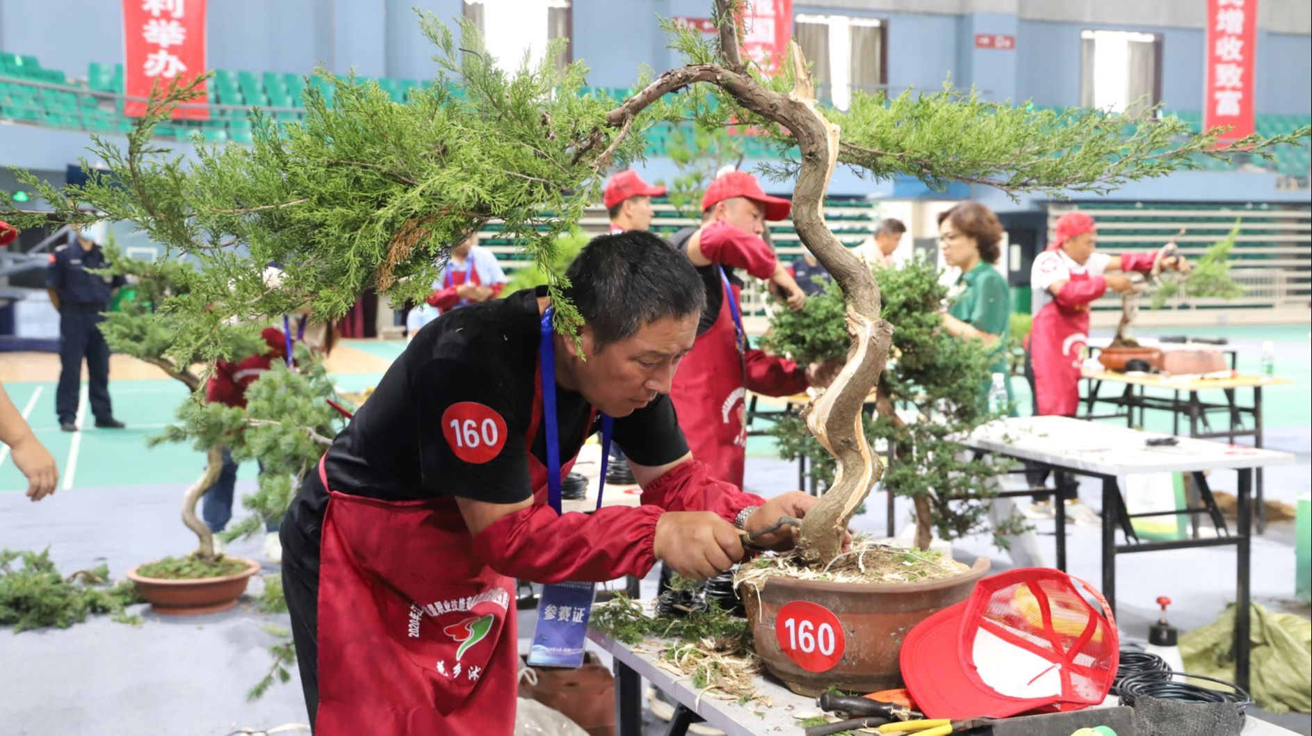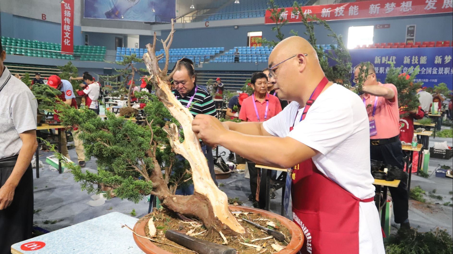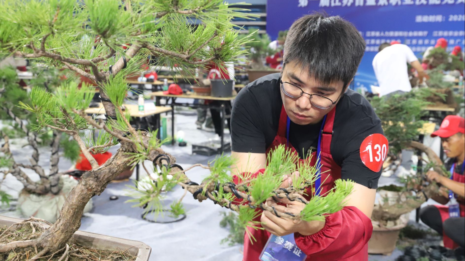 制作环节结束后,专业评委对每盆作品进行评比打分,授予前三名选手“江苏省技术能手”称号,同时授权机构颁发技师技能等级证书。成绩优异的选手将代表江苏队,参加9月28日在沭阳举行的全国盆景职业技能竞赛(决赛)。