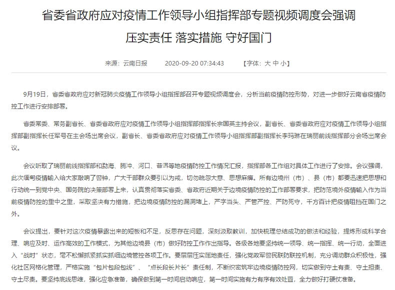 荔枝新闻讯 据云南省人民政府网站消息,9月19日,云南省委省政府应对新冠肺炎疫情工作领导小组指挥部召开专题视频调度会,分析当前疫情防控形势,对进一步做好云南省疫情防控工作进行安排部署。